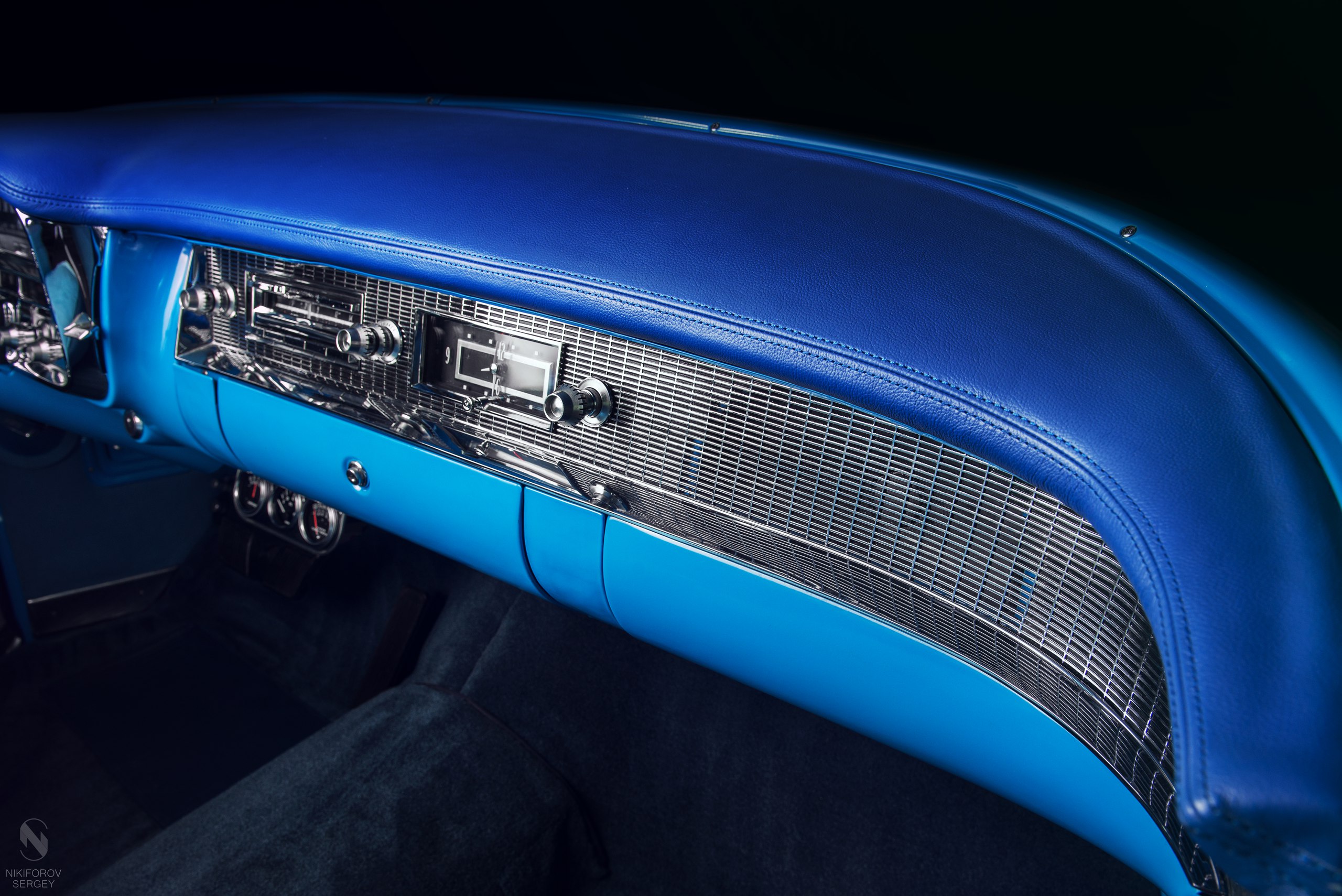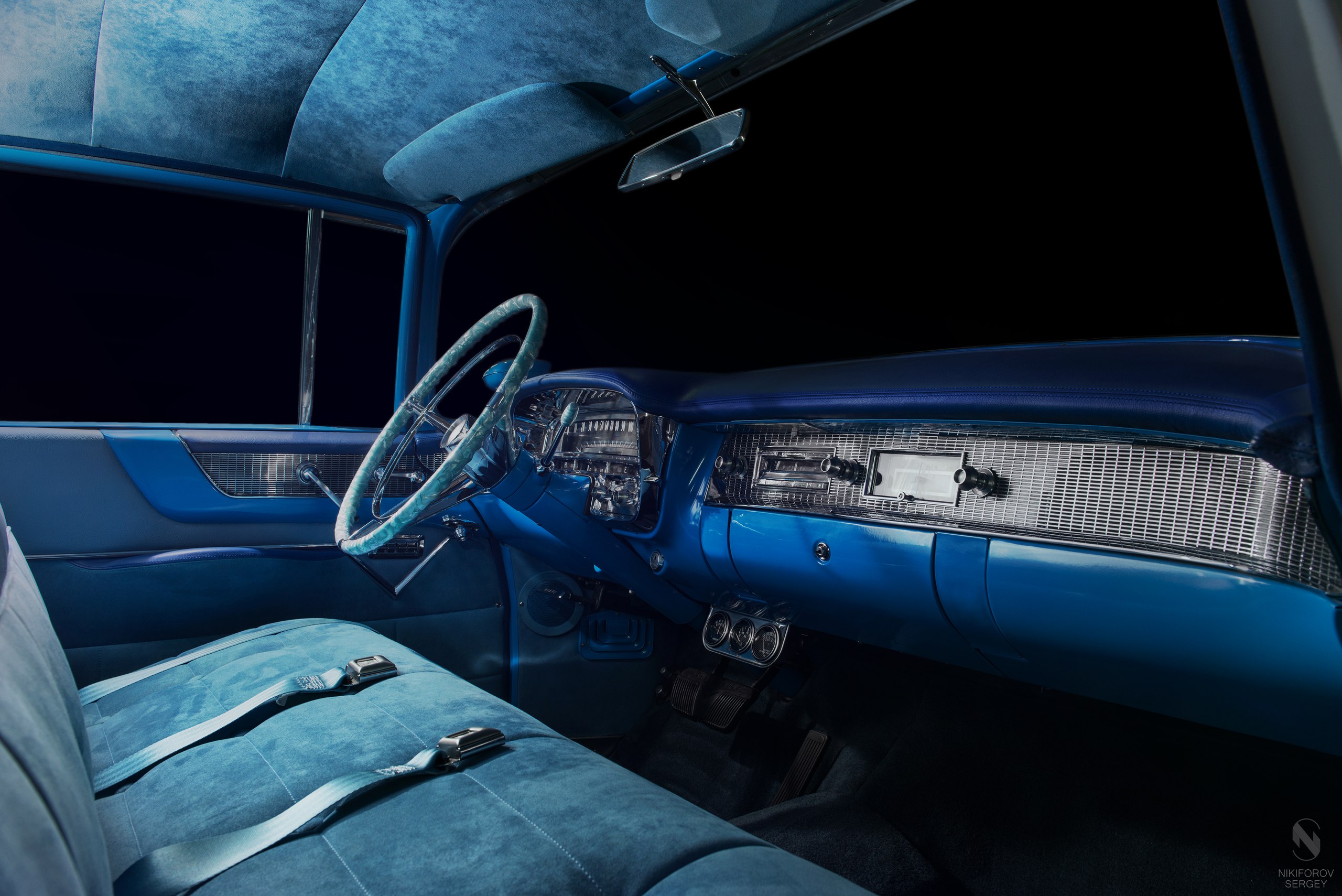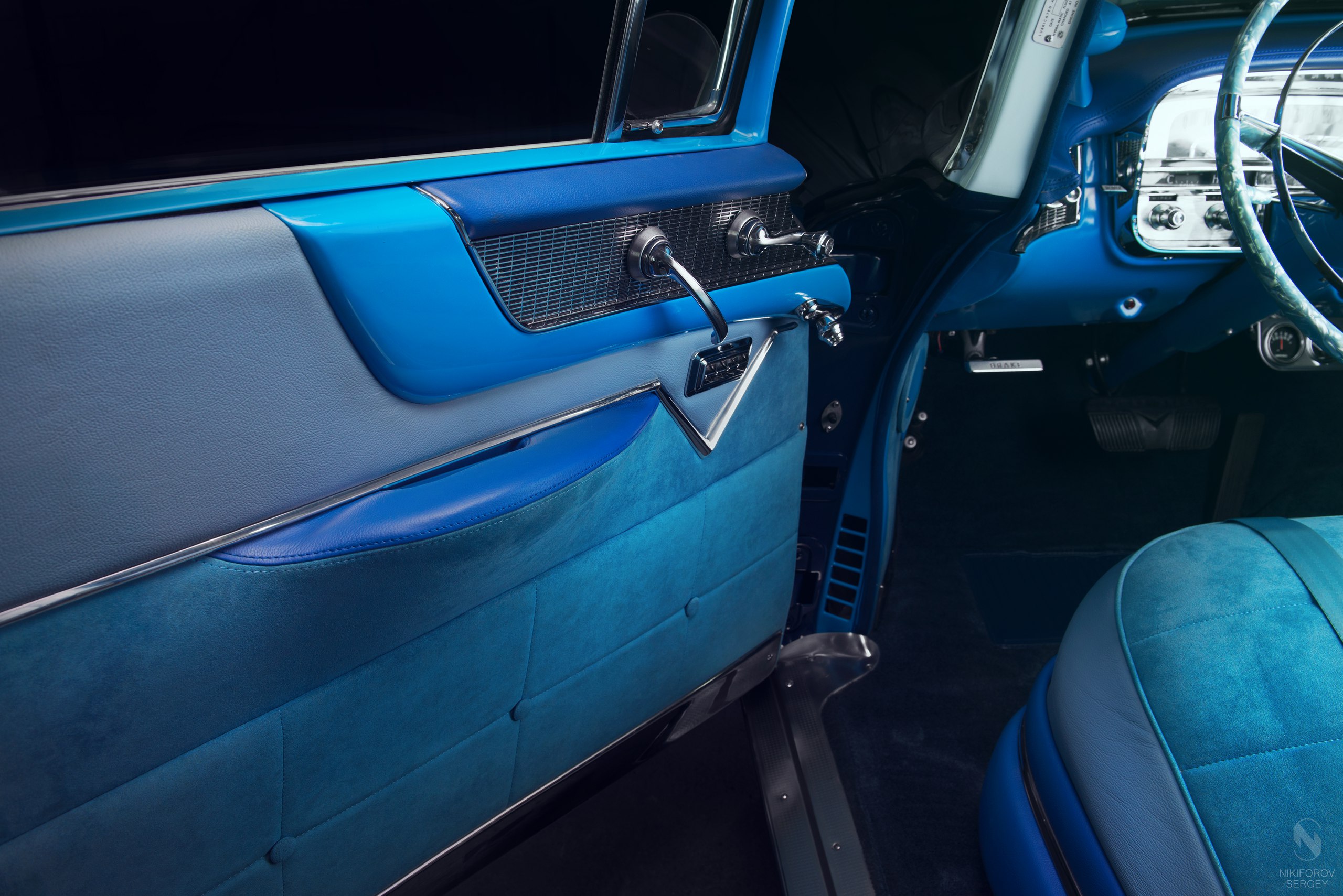 In this 1956 Cadillac Series 62, the interior becomes a single deep-blue statement by BLARE Design: velour on the bench seat, door panels and roof flows into a sculpted dashboard with polished metal inserts and a marbled steering wheel, so the car keeps its mid-century American luxury character in a calm, cinematic shade of blue.