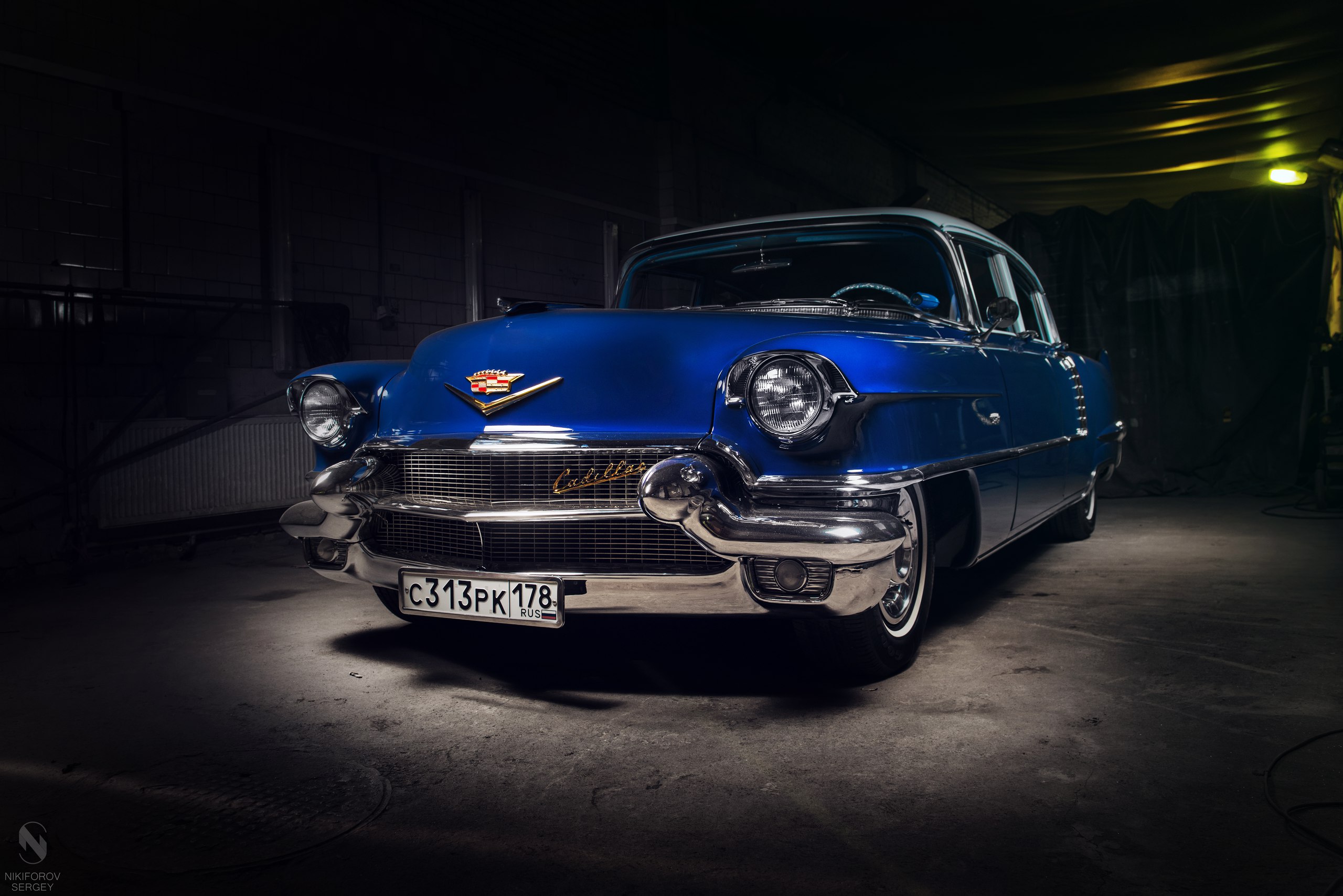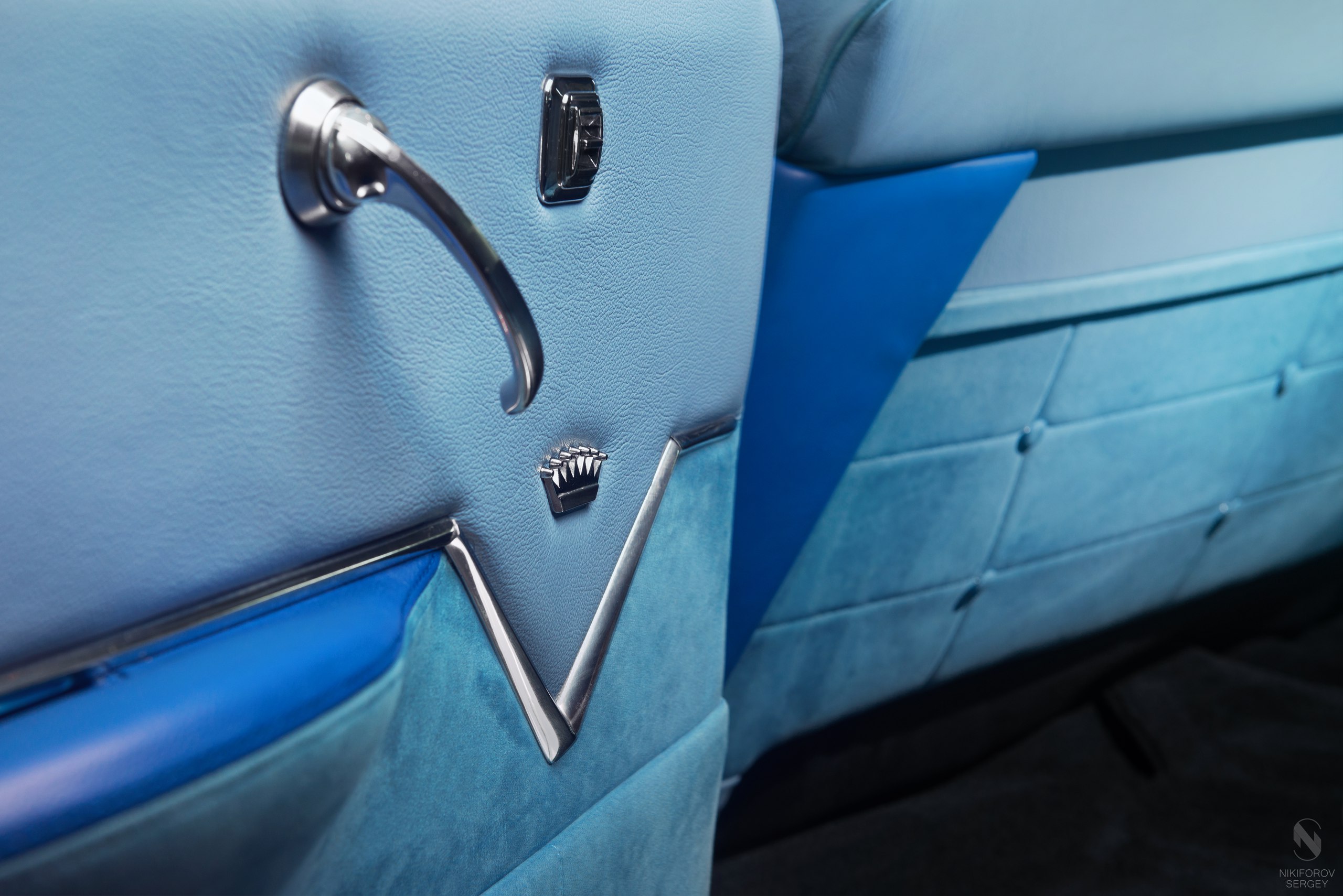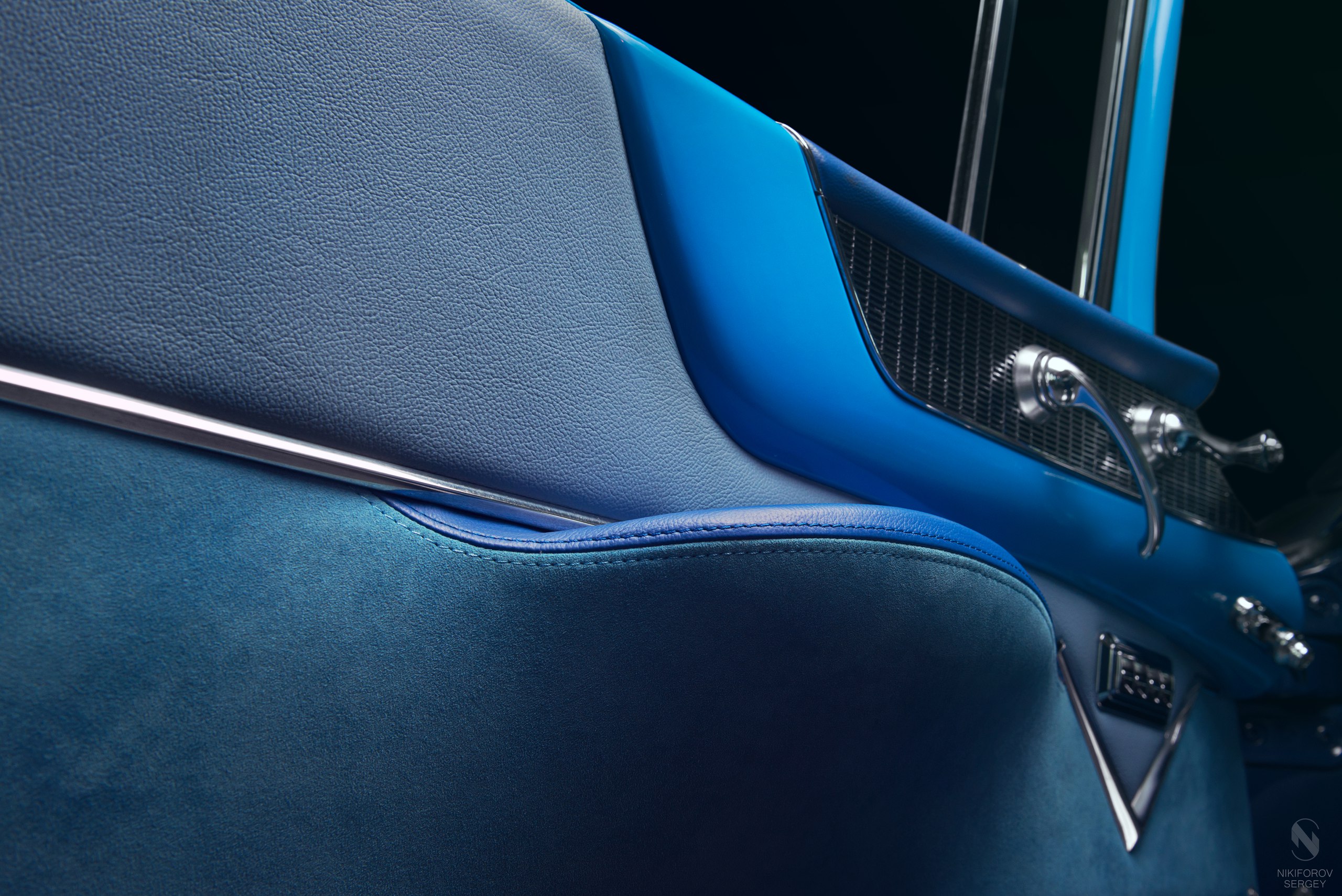 In this 1956 Cadillac Series 62, the interior becomes a single deep-blue statement by BLARE Design: velour on the bench seat, door panels and roof flows into a sculpted dashboard with polished metal inserts and a marbled steering wheel, so the car keeps its mid-century American luxury character in a calm, cinematic shade of blue.