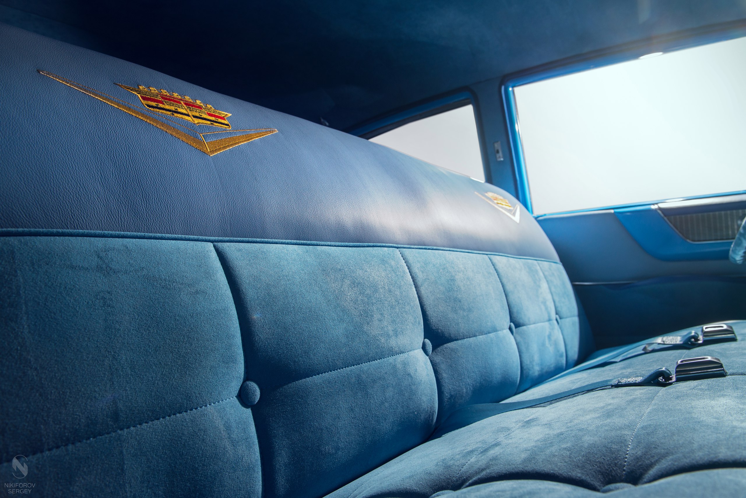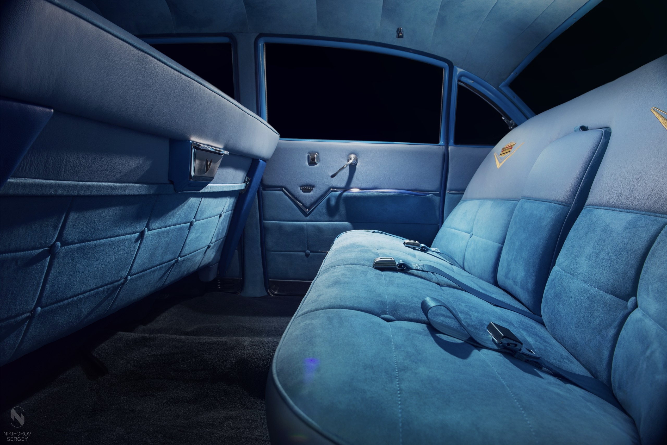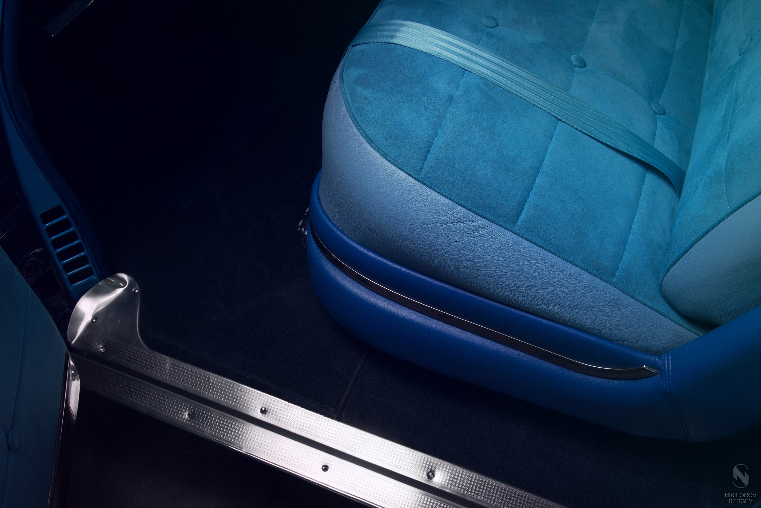 Full interior retrim • Monochrome deep-blue colour scheme • Velour bench seat with colour-matched belts • Sculpted dashboard with polished metal inserts and a marbled steering wheel
